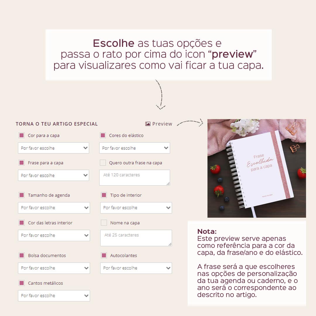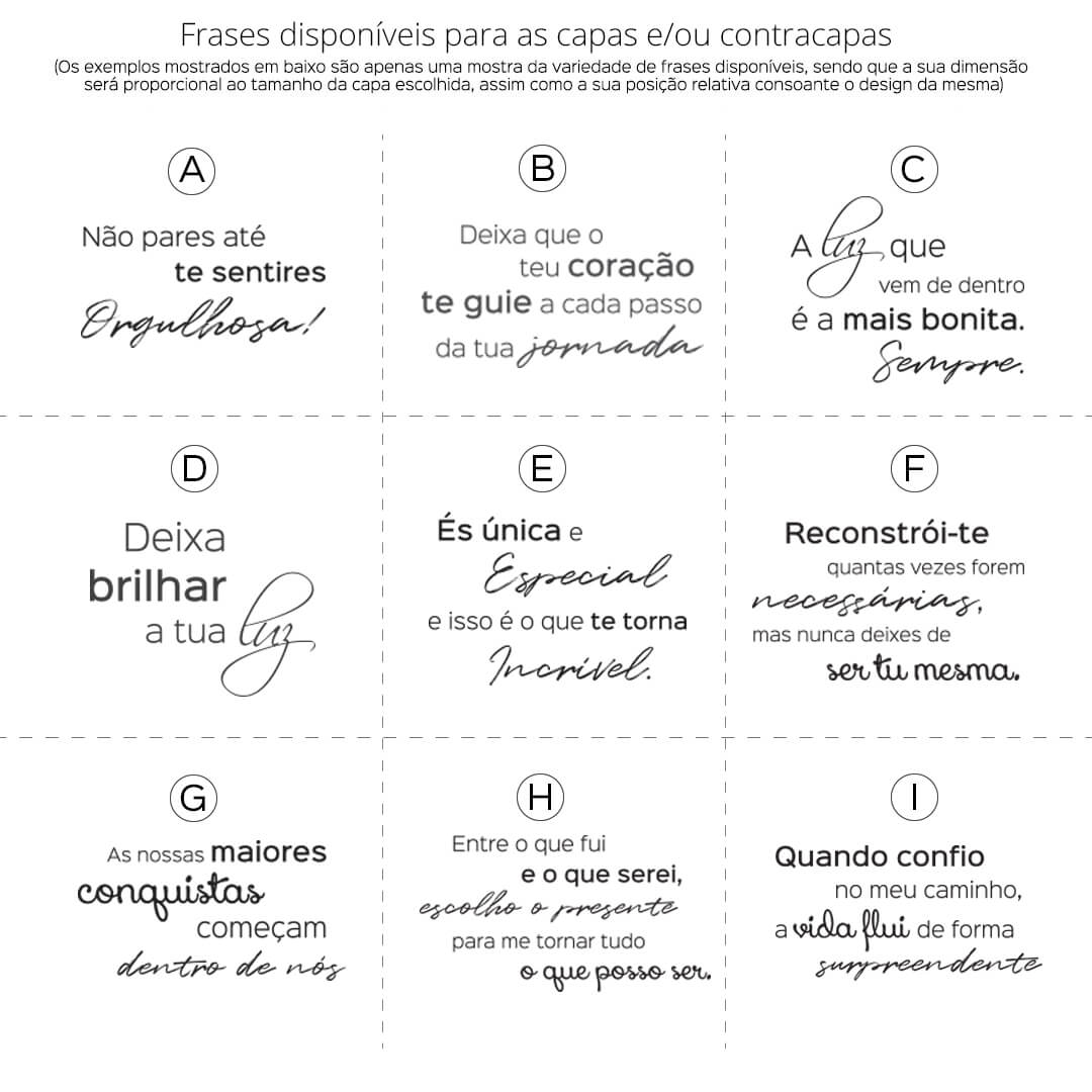 Nota: Para capas com logotipo/ilustração e frases personalizadas (opção "quero outra frase na capa"), será enviada por email uma maqueta para aprovação após encomenda confirmada. A mesma deverá ser validada num período de 24h, sendo que as respostas posteriores a esse tempo farão com que a encomenda possa transitar para o lote de produção seguinte, extendendo assim o prazo previsto inicialmente para o envio da mesma.