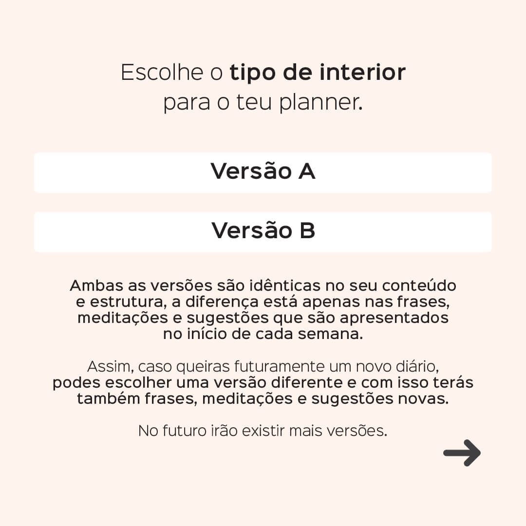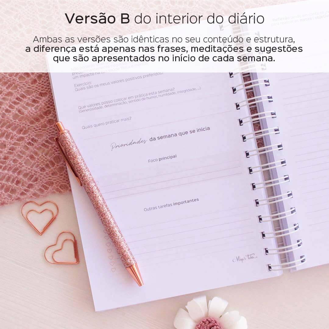 O diário tem 2 versões diferentes, onde encontras no interior frases motivadoras, mantras e exercícios distintos. Por isso, podes fazer esta "viagem" de autoestima 2 vezes, com as duas versões diferentes do diário e reforçar ainda mais o teu percurso de amor-próprio.