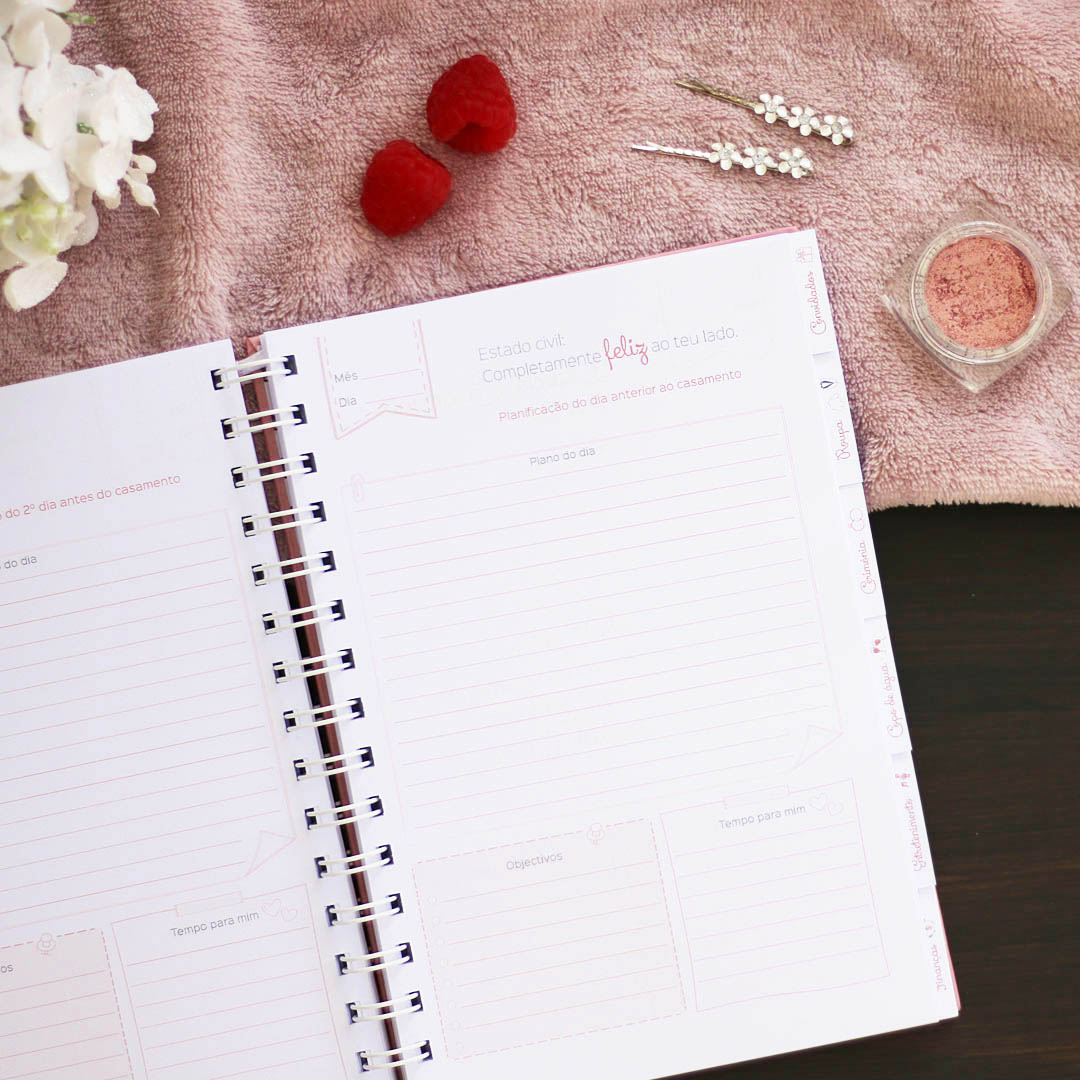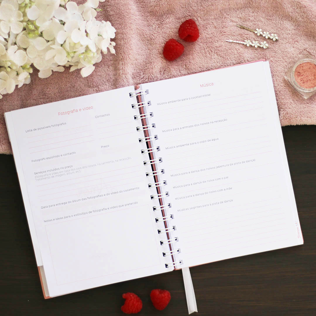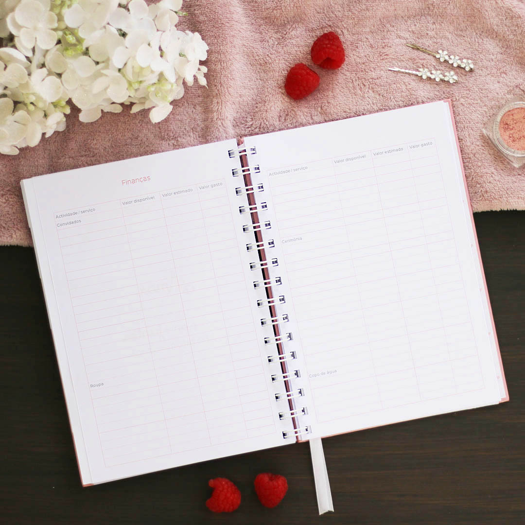 A agenda tem muitos detalhes importantes, para que possas organizar todos os pormenores relacionados com os convidados, a roupa, cabelo e maquilhagem, cerimónia, copo de água, mesas e decorações, entretenimento, fotografia, flores, presentes, finanças, até a lua de mel.