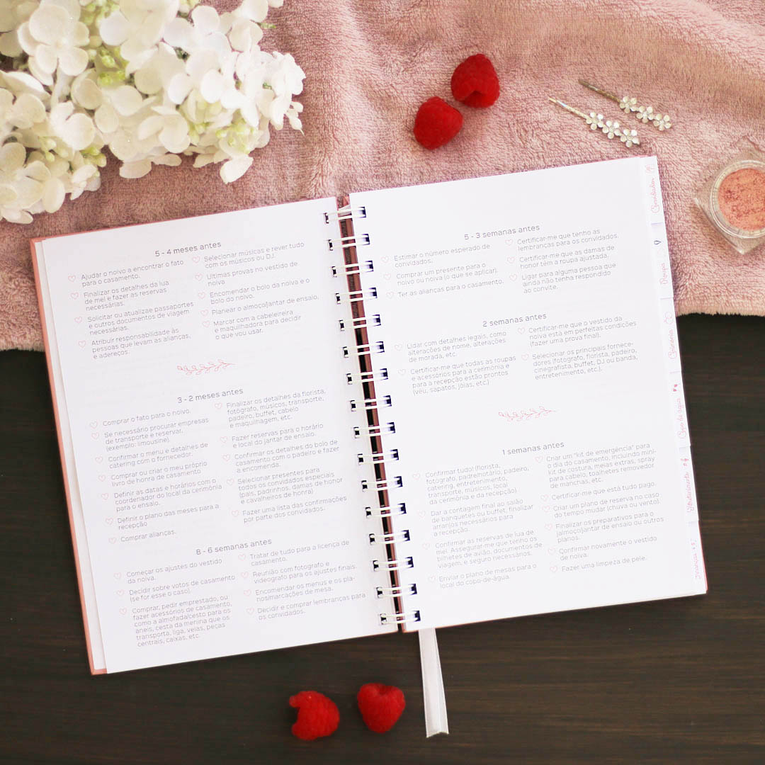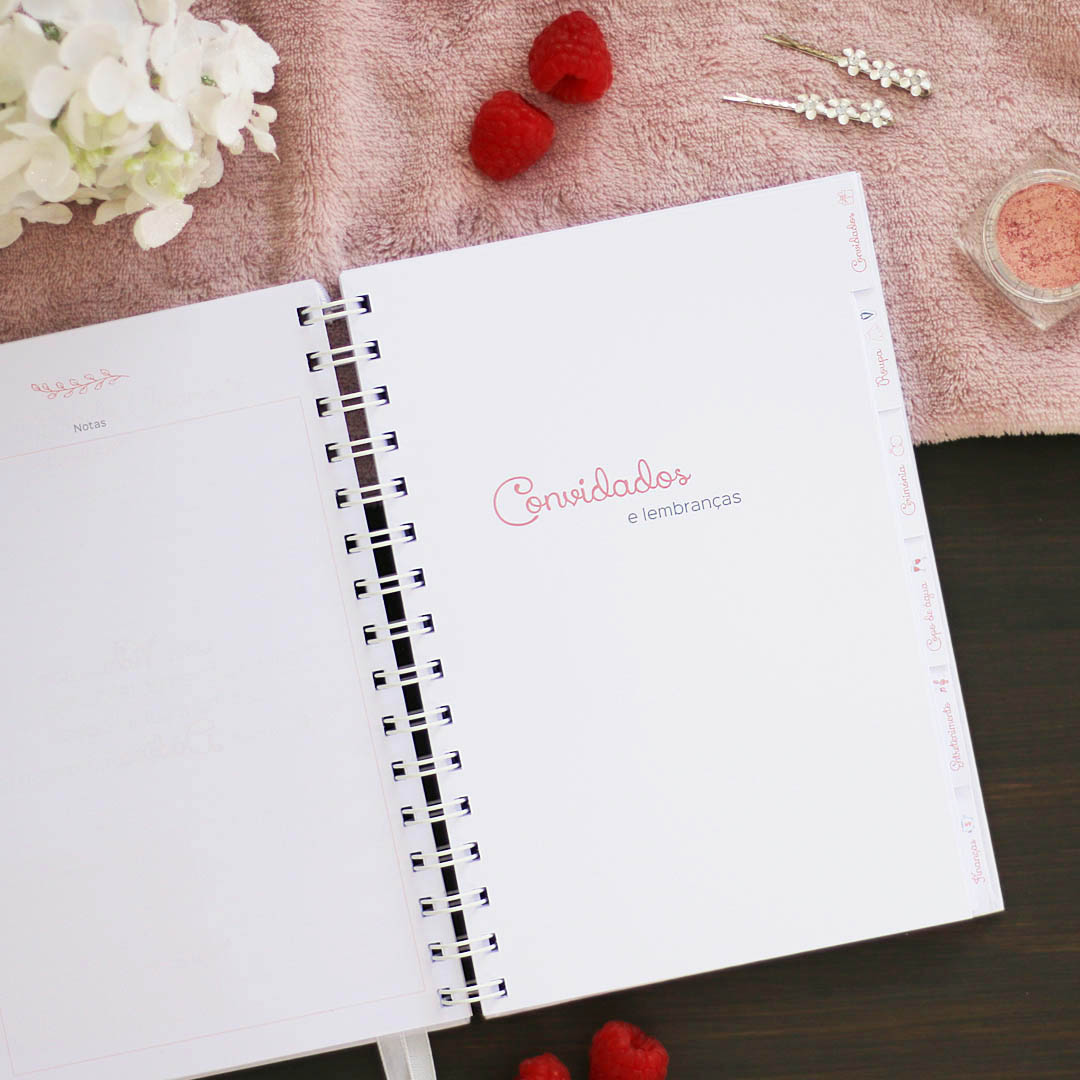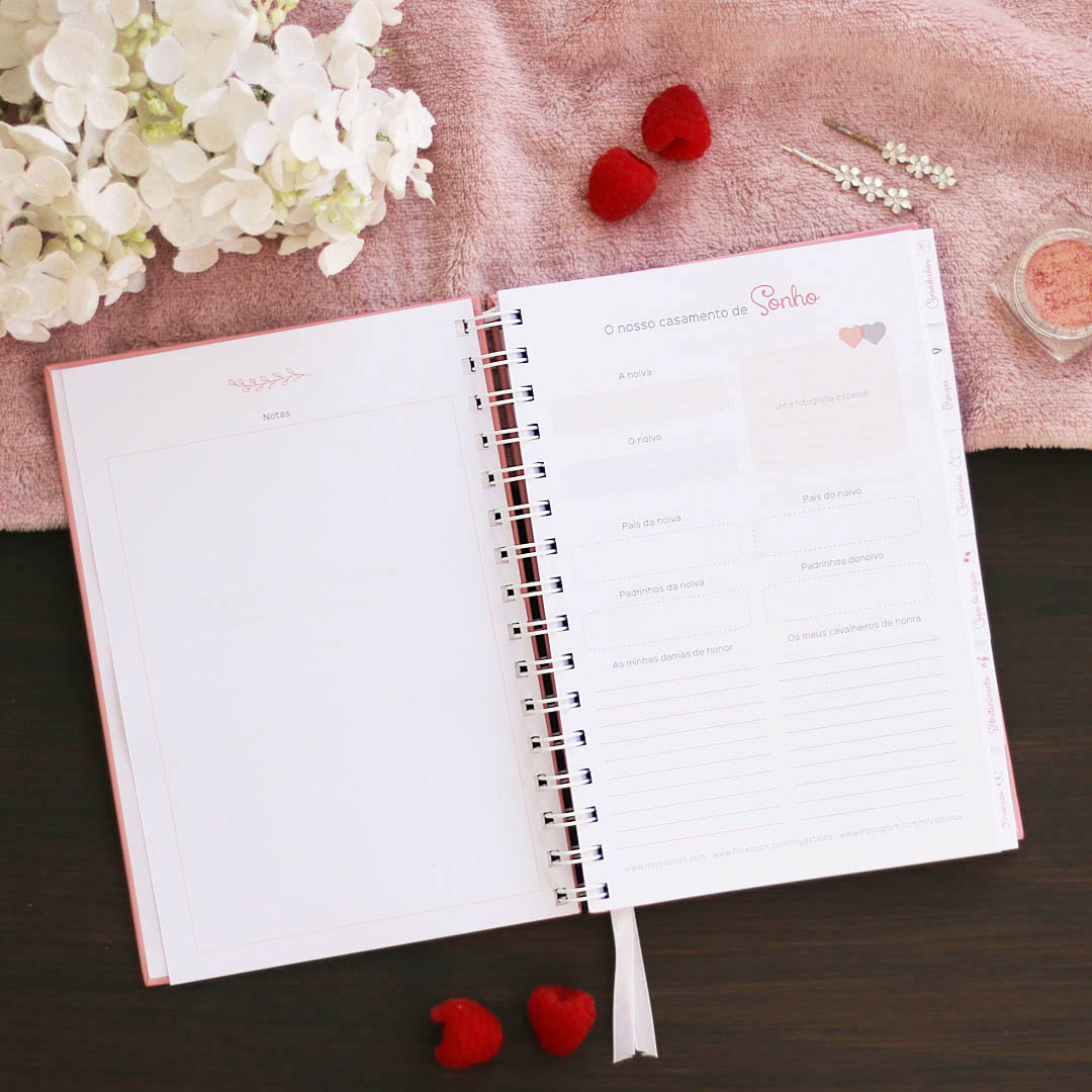 A agenda tem muitos detalhes importantes, para que possas organizar todos os pormenores relacionados com os convidados, a roupa, cabelo e maquilhagem, cerimónia, copo de água, mesas e decorações, entretenimento, fotografia, flores, presentes, finanças, até a lua de mel.