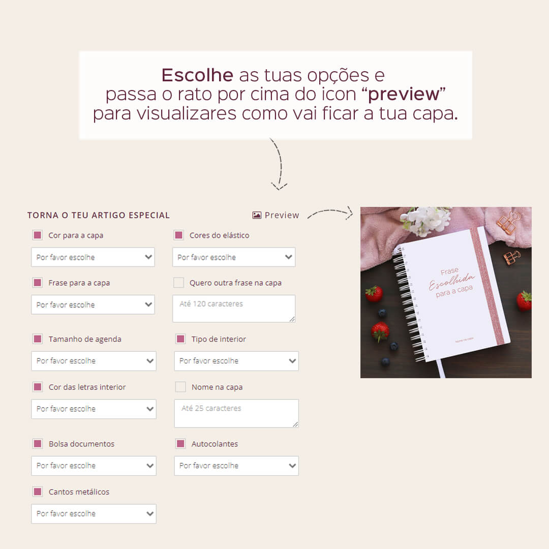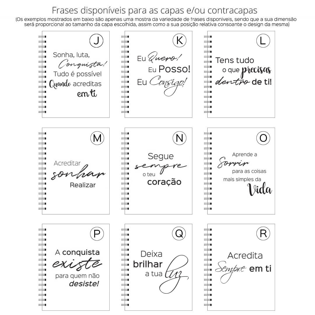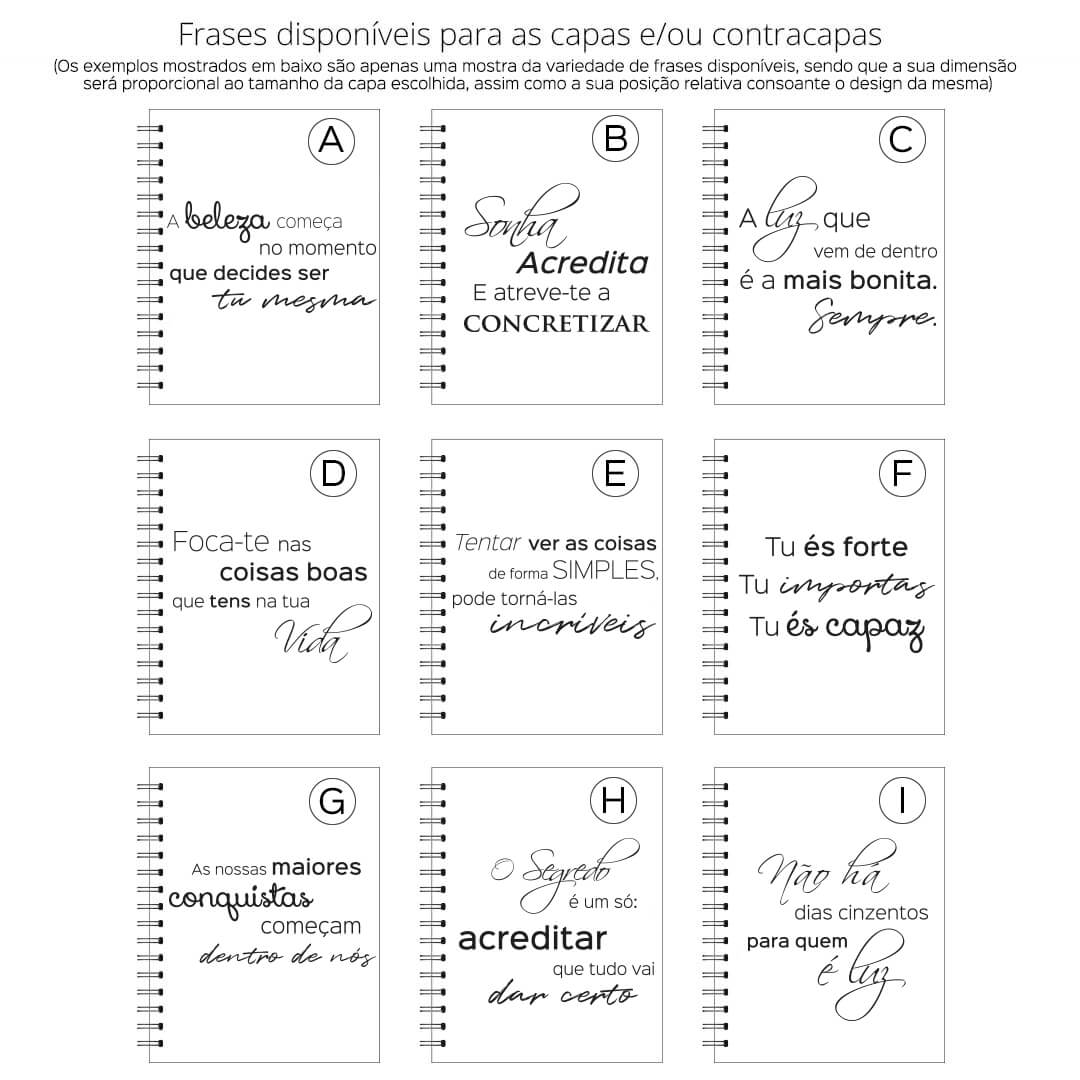 Nota: Para capas com logotipo/ilustração e frases personalizadas (opção "quero outra frase na capa"), será enviada por email uma maqueta para aprovação após encomenda confirmada. A mesma deverá ser validada num período de 24h, sendo que as respostas posteriores a esse tempo farão com que a encomenda possa transitar para o lote de produção seguinte, extendendo assim o prazo previsto inicialmente para o envio da mesma.
