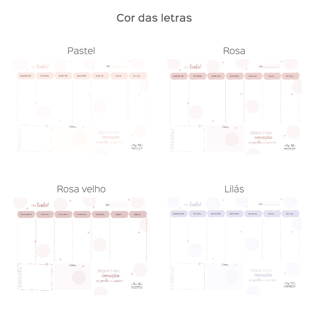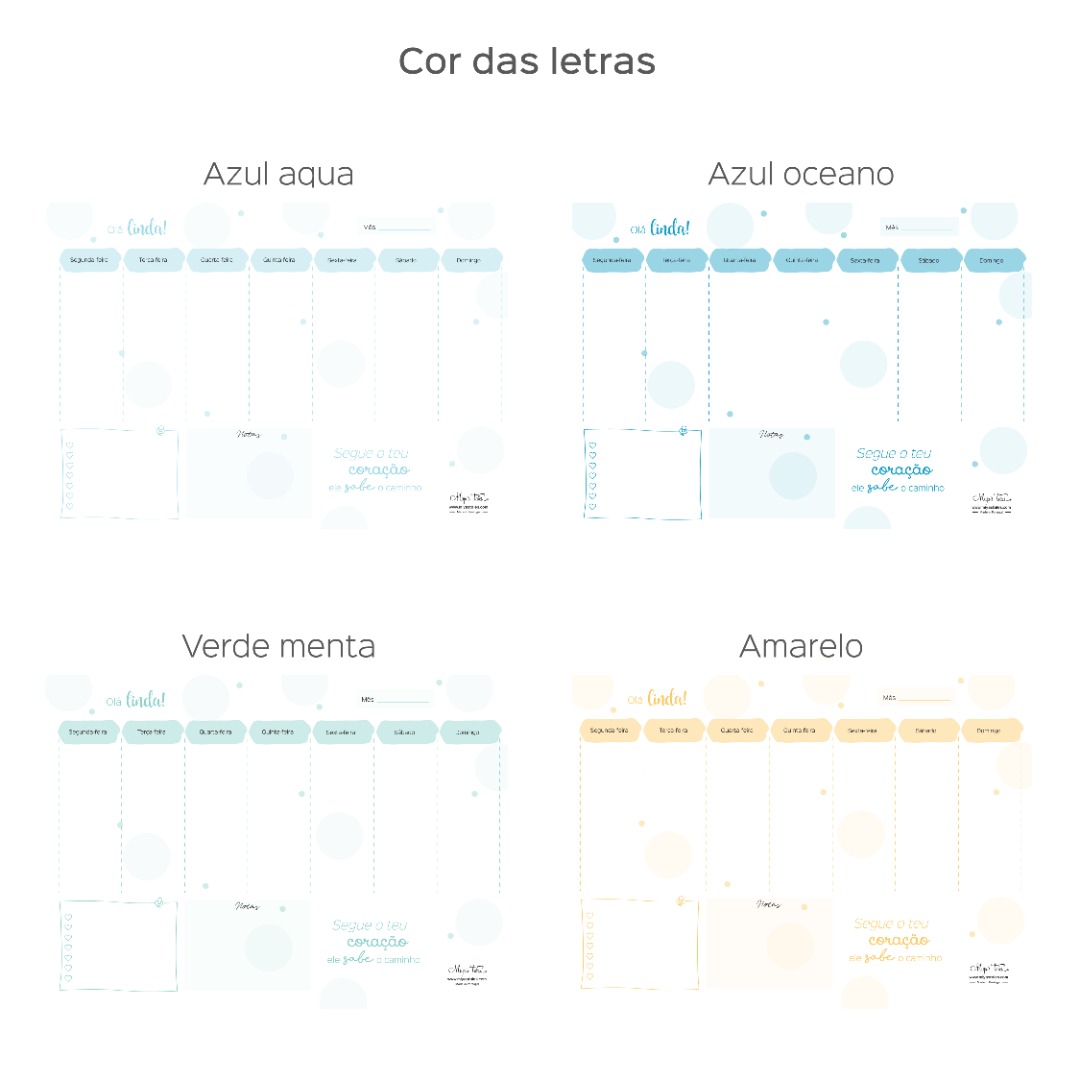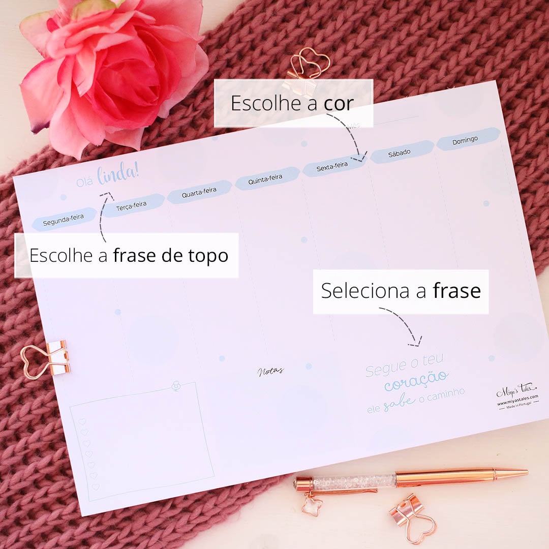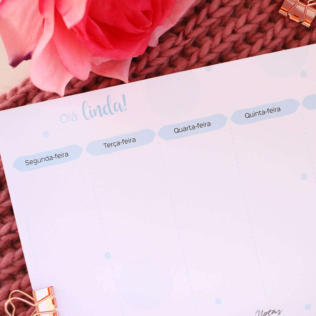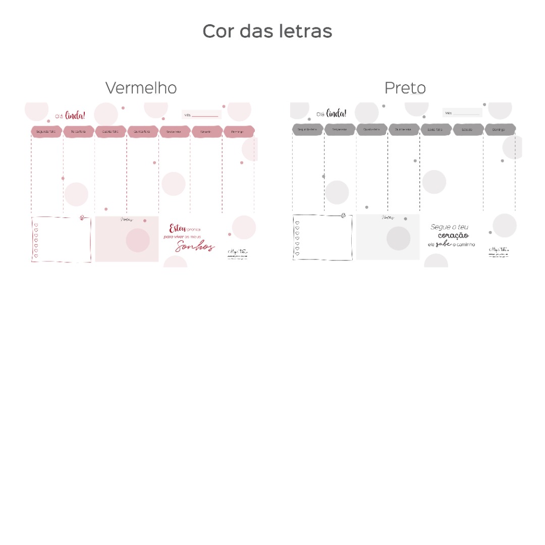 With this weekly planner (Portuguese version), you'll be able to better organize your days so that all your plans, dreams and ideas run smoothly.