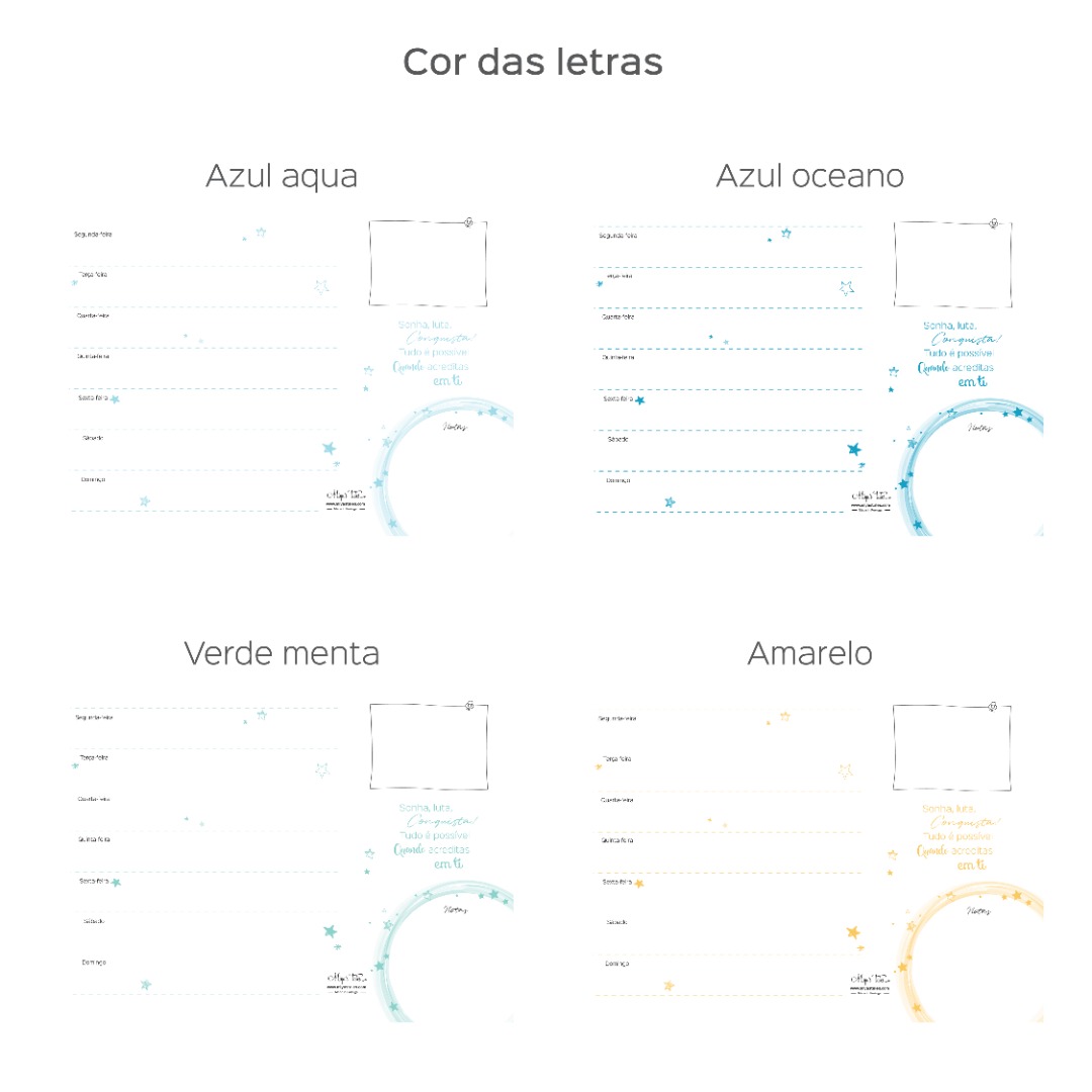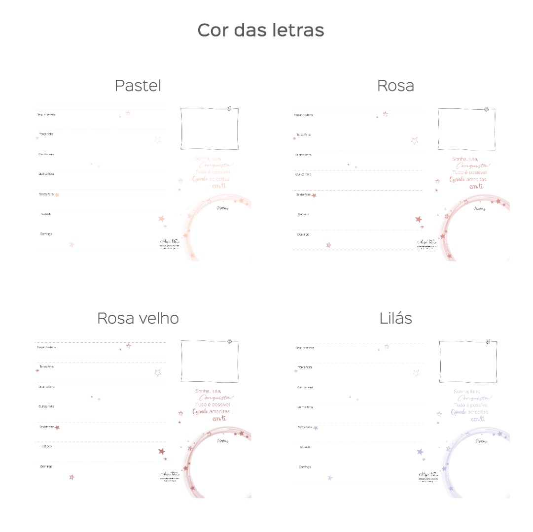 With this weekly planner (Portuguese version), you'll be able to better organize your days so that all your plans, dreams and ideas run smoothly.