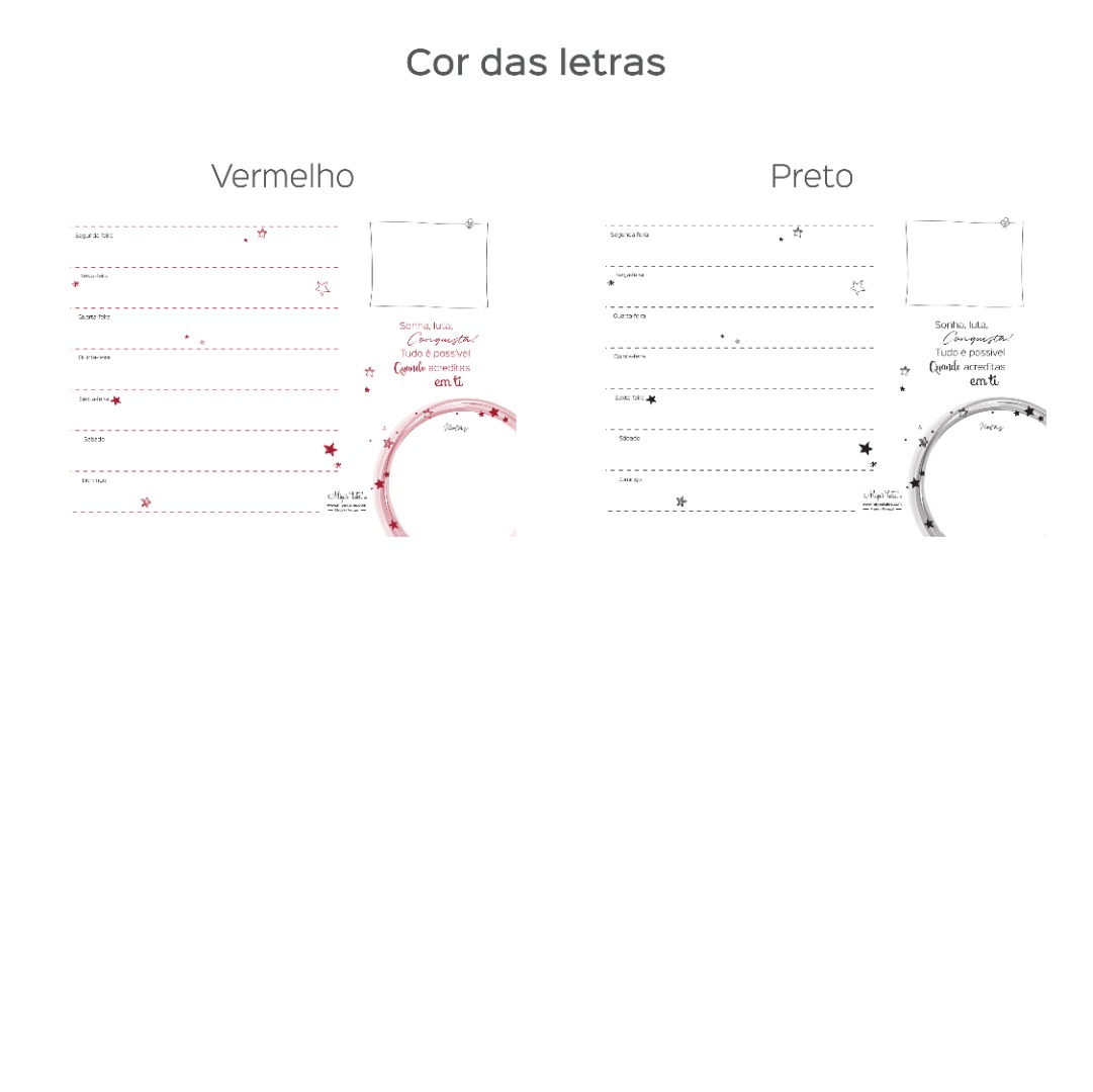 Nota: Para capas com logotipo/ilustração e frases personalizadas (opção "quero outra frase na capa"), será enviada por email uma maqueta para aprovação após encomenda confirmada. A mesma deverá ser validada num período de 24h, sendo que as respostas posteriores a esse tempo farão com que a encomenda possa transitar para o lote de produção seguinte, extendendo assim o prazo previsto inicialmente para o envio da mesma.