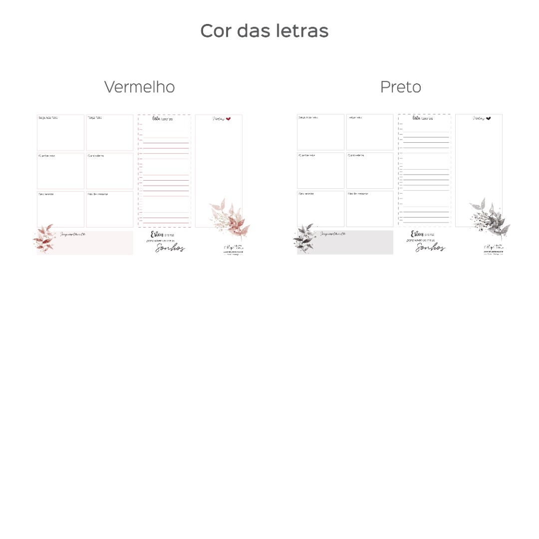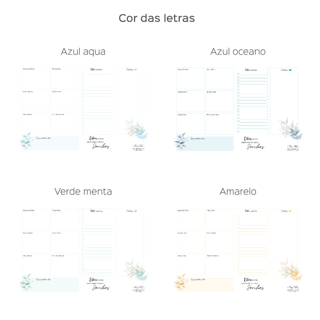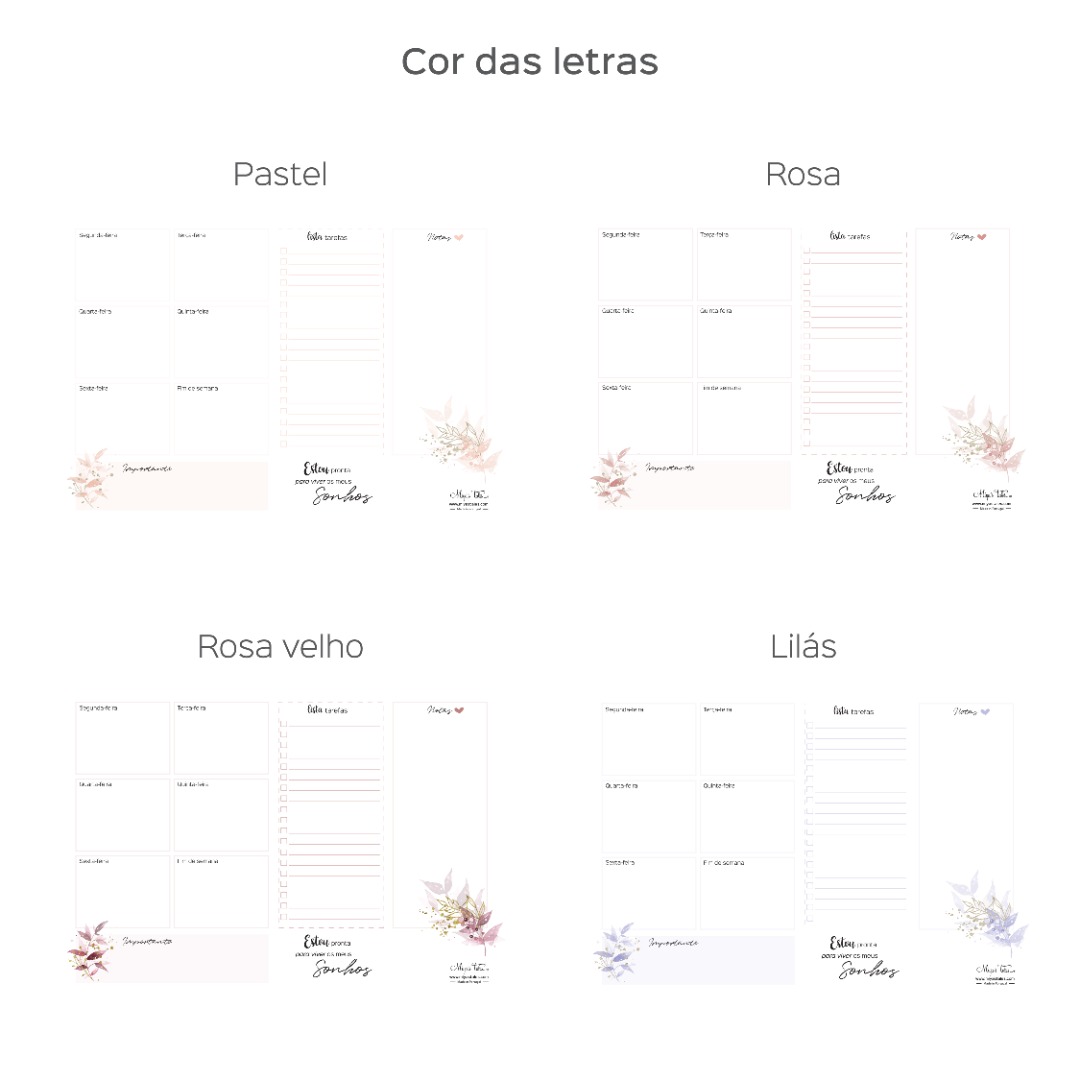 With this weekly planner (Portuguese version), you'll be able to better organize your days so that all your plans, dreams and ideas run smoothly.